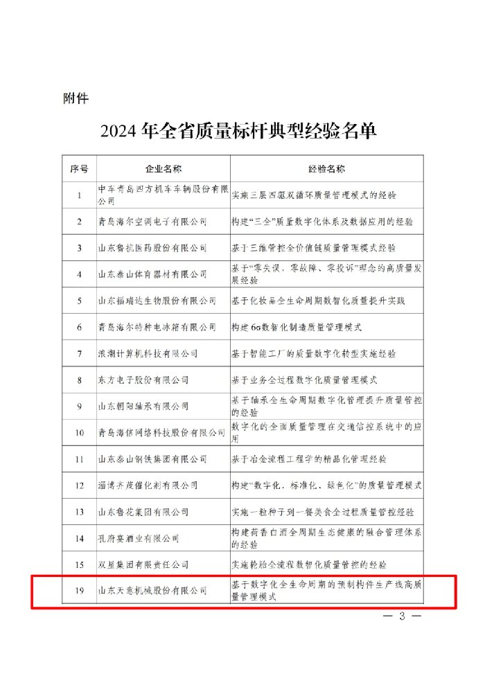 近日,山東省工業(yè)和信息化廳公布了全省質(zhì)量標(biāo)桿獎(jiǎng)。天意機(jī)械憑借在關(guān)鍵過程質(zhì)量控制方向的不懈探索,以基于數(shù)字化全生命周期的預(yù)制構(gòu)件生產(chǎn)線高質(zhì)量管理模式斬獲“2024年全省質(zhì)量標(biāo)桿”。